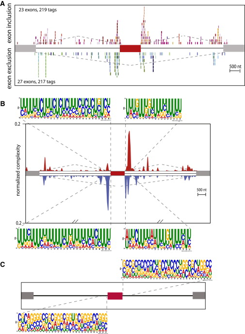 Figure 5. Normalized Complexity Map for nElavl-Dependent Alternative Splicing(A) nElavl tags mapping to nElavl-regulated cassette exons or flanking introns are plotted onto a composite transcript as a function of distance to the 5′ or 3′ junctions of the alternative exon. Tags from independent CLIP experiments are color coded. Red and gray boxes represent a generic alternative cassette exon and flanking constitutive exons, respectively.(B) Normalized complexity map of nElavl-dependent alternative splicing of cassette exons. Red and blue peaks represent binding associated with nElavl-dependent exon inclusion and exclusion, respectively. Motif preferences of 250 nt sequences flanking nElavl-regulated alternative exons are shown.(C) Motif preferences of 250 nt sequences flanking randomly selected alternative exons that display no change in isoform abundance in DKO mice are shown.See also Figure S2and Table S8.