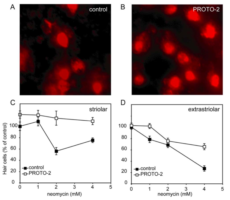 PROTO-2 protects against neomycin-induced hair cell death in cultured mouse striolar utricular hair cells.