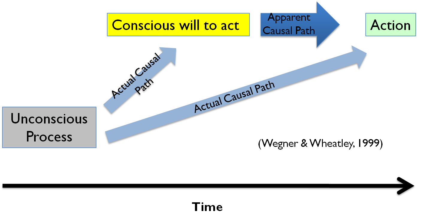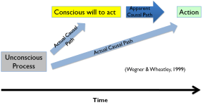 The sense of agency—that is, the knowledge that you have consciously willed and executed your own actions—is believed to be inferred from the temporal relationship between our thoughts and actions. For almost 20 years, Dr. Daniel Wegner, the epically-titled John Lindsley (?) Professor of Psychology in Memory of William James at Harvard University, has argued that our brains trick us into believing that our actions arise from our conscious commands to move, when in fact it is not our conscious command that drives the movement but an unconscious process that causes both the thought and the movement to occur separately1,2. The temporal contiguity between the thought and the movement incorrectly implies a causal relationship between the two. (See Figure 1)