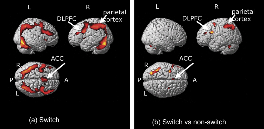 Here’s the task: Subjects were presented with a letter paired with a number. The color of the font indicated whether the subject should pay attention to the letter or the number. The subject then had to press the left button for a vowel or odd number, and press the right button for a consonant or even number. The subjects who received the drink with cocoa flavanols showed increased blood flow and activation in cortical areas of the brain (dorsolateral prefrontal cortex, anterior cingulate cortex, and parietal cortex, see figure below) compared to baseline measurements. However, they did not improve task performance. So there are some changes in brain blood flow after drinking the flavanols, and maybe the authors just needed to look at a different task that is affected by those changes in brain activation.