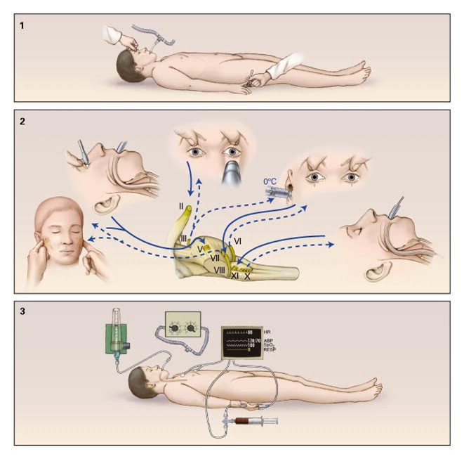 Figure 2. The three-step process to declare someone brain dead in the U.S. 1) Use painful stimuli to test the overall responsiveness of the individual. 2) If no responsiveness is found, test the cranial nerves to test the degree of function in the brain stem. 3) If the brain-stem is non-responsive, test the ability of the brain to sustain self-breathing. If the patient fails all 3 tests, they can be declared brain dead.