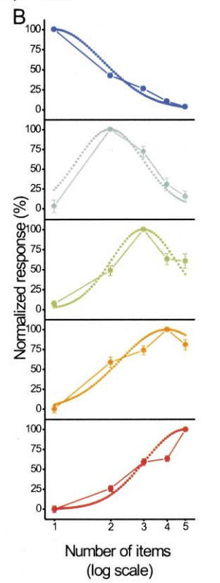 The graphs show firing rates for neurons with varying numerosity preferences. For example, in the second graph from the top, the neurons preferring 2 items fired far more when the monkey saw 2 dots, next most when he saw 3 dots, and next most for 1 dot.