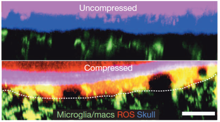 Figure from Roth et al. (2014) showing the overreactive immune response to concussions in the brain. Immune cells are in green and the damaging chemicals they use to kill bacteria and viruses are in red.