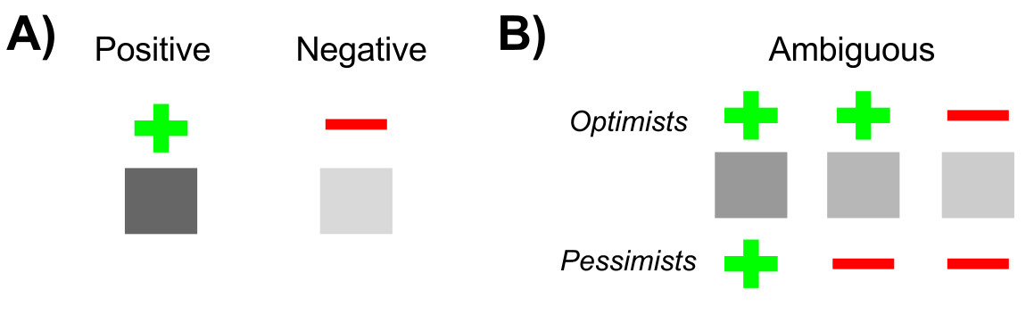 Figure 1. This is an illustration of the ‘ambiguous cue’ task. A) Animals are trained to press one lever in response to a dark grey square to receive a reward. They are trained to press a second lever in response to the light grey square to avoid a punishment. B) Then the animal is shown cues that are ambiguous in that they are a mix of both the positive and negative stimuli. Both an optimistic and pessimistic animal will respond correctly to ambiguous cues that are close to either the reward or punishment color. But optimists will assume that squares that are equal parts reward and punishment are reward stimuli while pessimistic animals will assume that the same squares are punishment stimuli. This is the essence of the divide between optimists and pessimists: when presented with the exact same information, they will respond differently based on their biases.