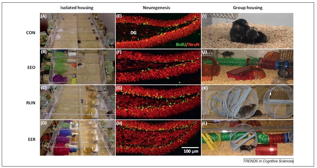 Studies show that living conditions with both running wheels alone (C and K) and running wheels with other types of environment enrichment (D and L) can enhance neurogenesis compared to empty cages (A and J) and enriched environment without wheels (B and J) [3,4]. The greenish yellow cells in panels E-H represent dividing cells in the dentate gyrus of the hippocampus. Figure adapted from Voss et al 2013 [18].