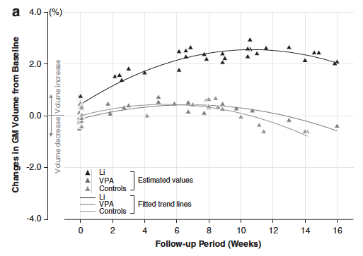 Another line of research suggests that lithium may not only be a neuro-protective agent (thereby guarding against the degenerative processes contributing to dementia) but may actually promote neurogenesis. One study found that patients diagnosed with bipolar disorder who had been taking lithium, compared both to untreated patients and healthy controls, were found to have increased gray matter volume across the brain. While this study could not make many claims about causality due to the constraints of the methodology, a subsequent study took a longitudinal approach and replicated the results, finding that over the course of sixteen weeks of treatment, the prescription of lithium was positively associated both with gray matter volume and treatment outcome [Figure 4].