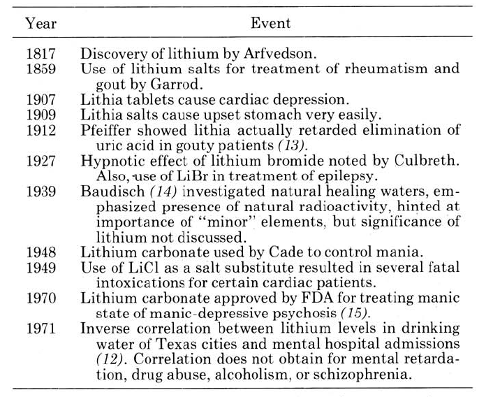 Johan Arfvedson is credited with the discovery of lithium in 1817 by isolating it as a salt. By the middle of the century, lithium was being used for medical purposes, primarily to treat gout (a type of arthritis) and rheumatism [see Figure 1 for a brief medical history through 1971)], and by the end of the century artsy types likes Mark Twain were enjoying naturally-occurring lithium salt baths in locations such as Lithia Springs, GA.