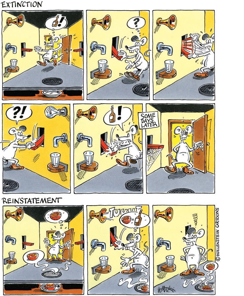 After extinction, animals typically go through reinstatement sessions to test for drug relapse. They are put in the exact same operant box where they originally took the drug, also with the same cues like lights or sounds, and they can press the lever. But this time they don’t get any drug. In these reinstatement or relapse sessions, the number of times the animal presses the lever is a measure of how much the context and cues drive the animal to seek drugs despite the fact that they learned lever pressing doesn’t give drugs anymore from the extinction sessions or “rehab.” Researchers can look at the biochemical changes in the brain during reinstatement to figure out the biology behind drug relapse.
