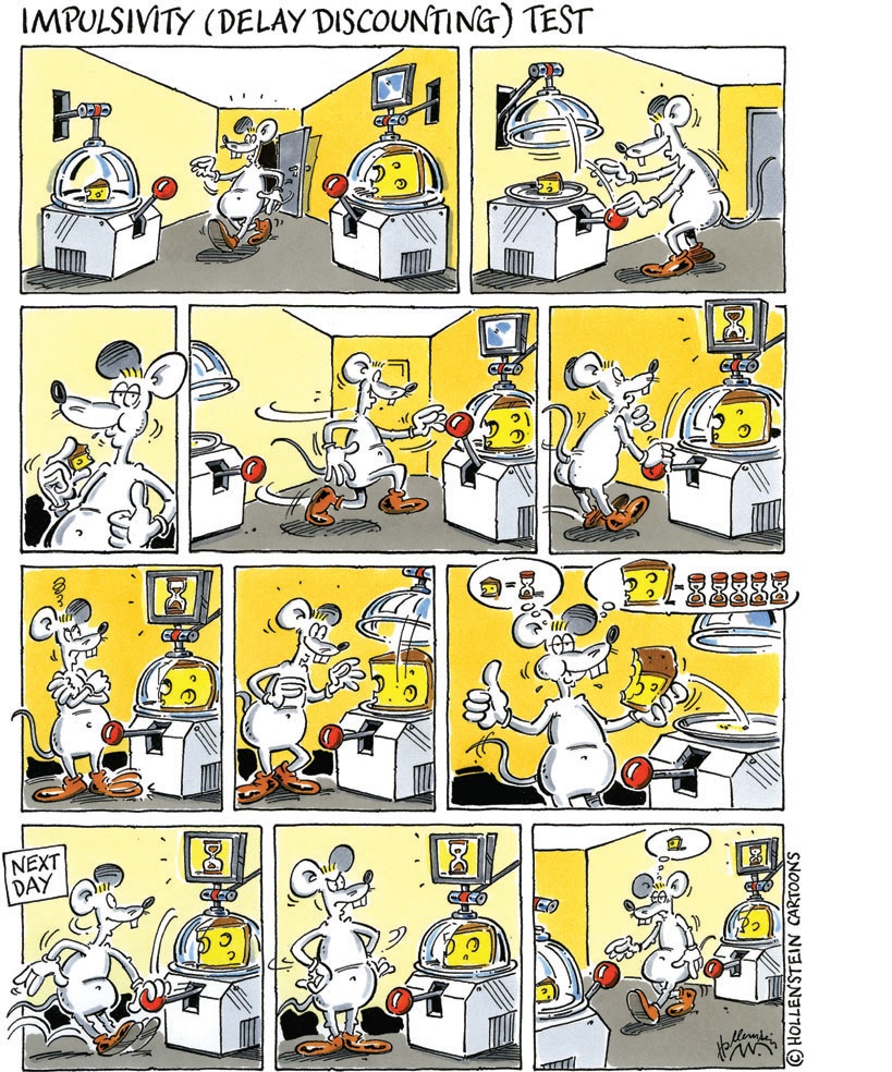 We can also change the amount of time between presses or pokes to see how patiently the animal will wait before responding as a measure of impulsive behavior (4). The impulsive animal will not be able to wait long enough and will press the lever too soon, while the less impulsive animal will wait a longer amount of time in order to get a bigger dose of drug.