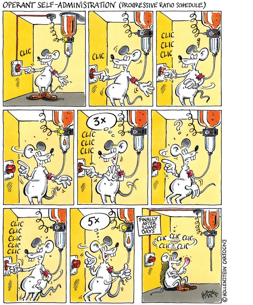 Illustration of operant self-administration on a progressive ratio schedule in which the animal must press more and more times in order to receive one hit of drug (4).