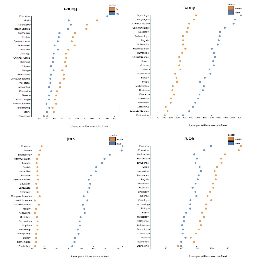 Expectations based on gender affect more than our self-perception—they affect how we perceive the actions of others in work and academic settings. When undergraduates assess their college instructors, students systematically associate their male and female instructors with different traits—both positive and negative. Across disciplines, ratings for female instructors are more likely to include words like “nice” and “caring” but less likely to include “funny,” “intelligent,” and “smart” (by a landslide). Male instructors’ ratings are more likely to include both “jerk” and “boring,” but less likely to include “rude,” “strict,” or “unfair.” The conclusion that these data suggest is that students might be evaluating professors along different dimensions from the start. If you’re interested in checking out other word-gender pairings, check out the interactive graphing tool created by history professor Ben Schmidt.