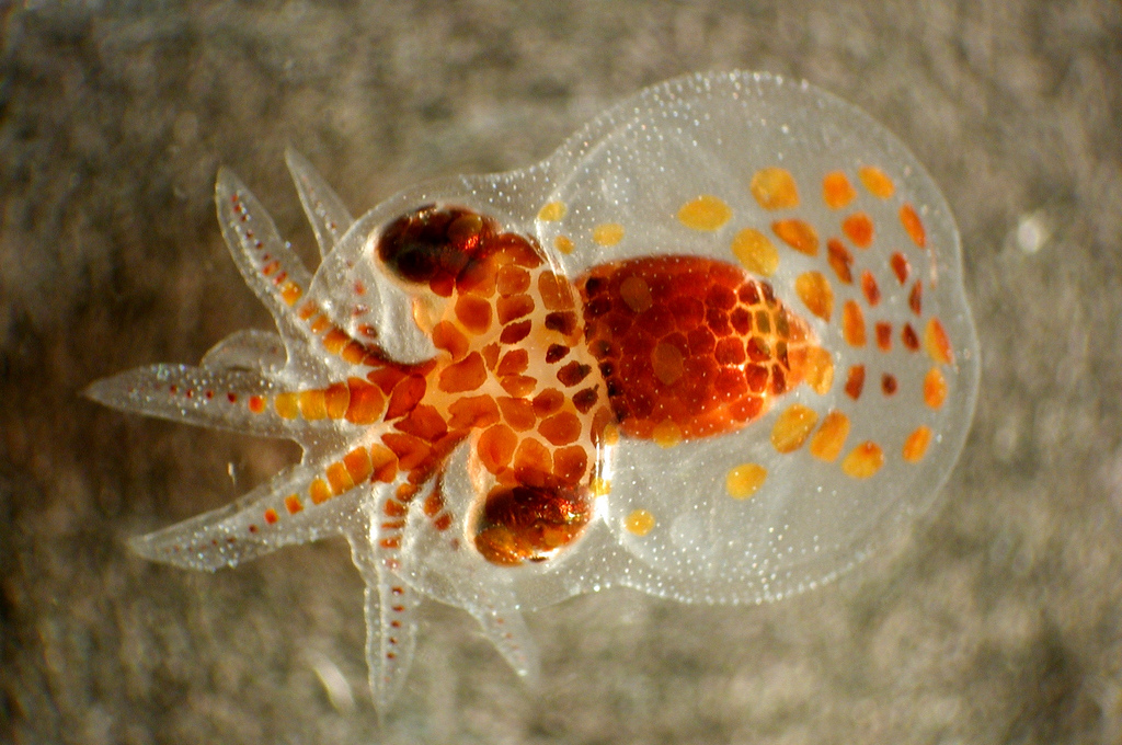 An adorable (?) representative of cephalopod larvae, with color-changing chromatophores. For most cephalopods, only the larval stage can be properly called “planktonic”, since the adults are capable swimmers. [c]