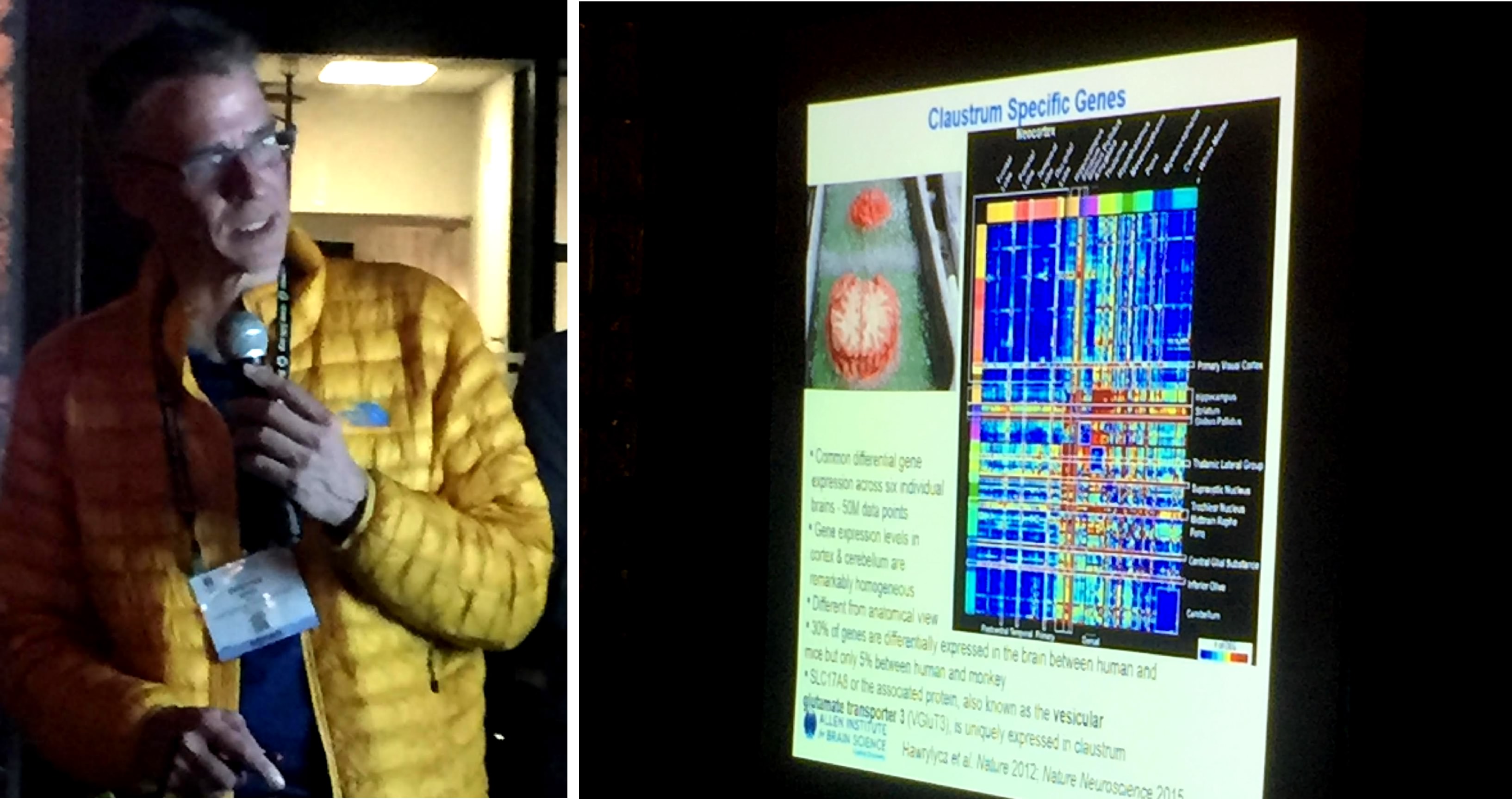 Lastly, Dr. Koch presented data from his fellow researchers at the Allen Institute who have recently characterized the gene expression in the claustrum of humans, and identified the protein “vesicular glutamate transporter 3 (vGluT3), as being uniquely expressed in the claustrum compared to the other tissue within the central nervous system. This finding is an important step towards identifying what makes the claustrum different from other brain regions, and allowing future research to explore the role of vGluT3 in unraveling the function of the claustrum.