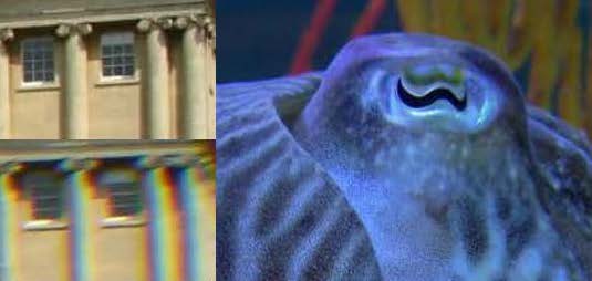 An example of chromatic aberration similar to what you might experience after getting your pupils dilated (left) and an example of the oddly shaped pupils found in cephalopods (right).