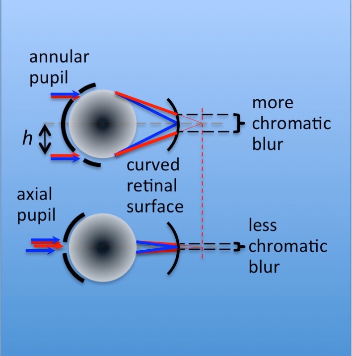 A figure from the researchers who proposed that cephalopods use chromatic aberration to gain color information [10]. The figure demonstrates how pupil shape and size affects the level of chromatic aberration with pupils like ours (bottom) producing less compared to pupils found in cephalopods (top).