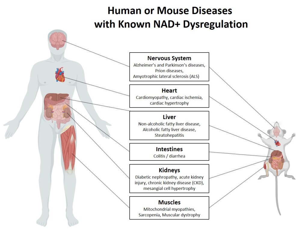 It might be said that every disease has some aspect of the above: basically, a failure to perform critical functions gets worse over time, eventually leading to pathology and potentially progressing to death. Pellagra develops because not enough Vitamin B3 is consumed, so not enough NAD+ can be synthesized. Is it possible then that a “side effect” of every disease could include some dysregulation of NAD+?