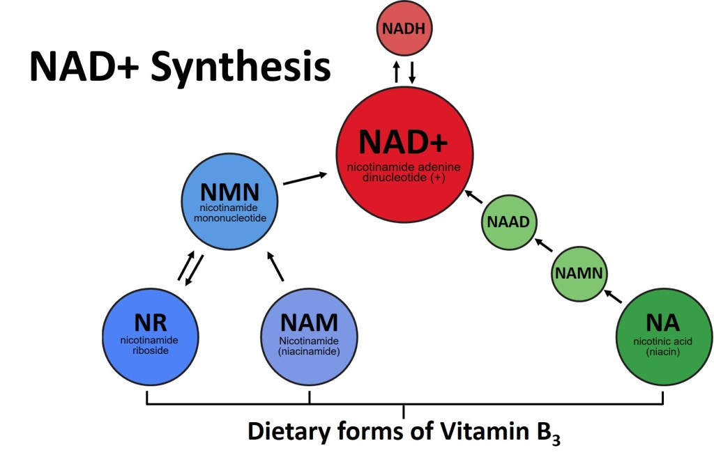 Note: NAD+ and NADH are so intricately tied together, they are often referred to by others and within this article as NAD+/NADH in tandem, or simply as just NAD+.