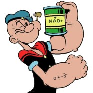 NAD+ is the common abbreviation of nicotinamide adenine dinucleotide – a relatively small molecule built by linking nicotinamides (processed vitamin B3) and adenine (the “A” in DNA’s A’s, T’s, C’s, and Gs). The “+” denotation comes from its positive electrical charge: at the molecular level, it is an electron short of happy, and will gladly take an electron from a willing donor (of which there are many). Normally this turns NAD+ into its molecular sibling, NADH, which is identical in structure except for the addition of two electrons and hydrogen (H). NADH will readily donate its hydrogen (and two electrons) to a willing recipient to convert itself back to NAD+, and does so regularly.