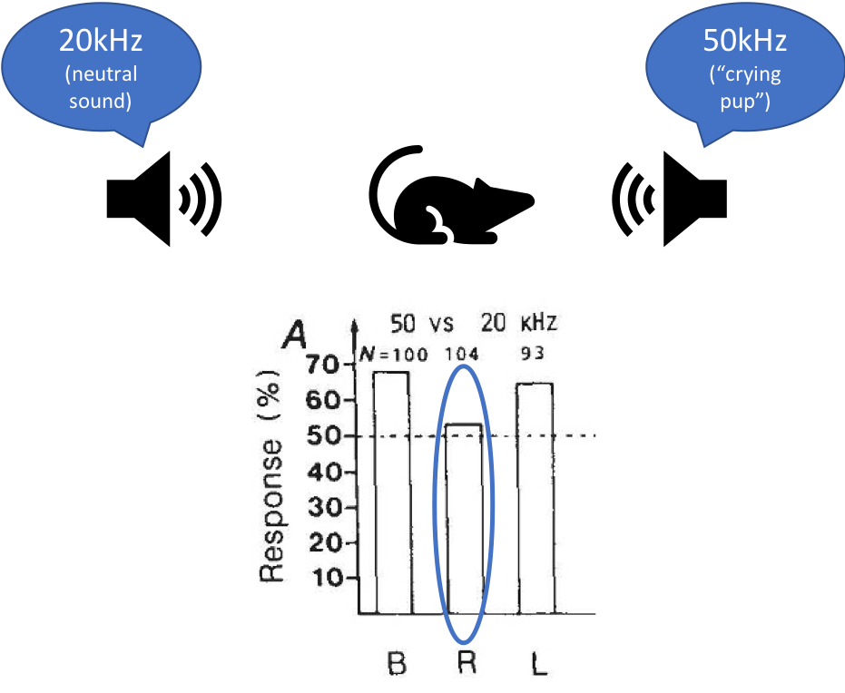 In Ehret’s experiment, mouse mothers were placed onto a running board with speakers on either end playing one of two different sounds, one of which resembled pup cries. Ehret then tested their preference for approaching the speaker that played the artificial pup cries under three conditions: when their left ear was plugged, when their right ear was plugged, or when both ears were open. Fascinatingly, while the mouse moms preferentially moved towards the speaker playing artificial pup calls when both ears or just the right ear was open, this preference disappeared when their right ear was closed. Since the left hemisphere of the brain primarily processes sounds coming in through the right ear and vice versa, this would suggest that auditory processing in specifically the left hemisphere of the brain is needed for the mouse moms to recognize the cries of their discomfited pups. Interestingly, this right ear/left brain bias for pup cries was absent in inexperienced female mice who had not learned the association between these high-frequency sounds and distressed pups. If they were trained to approach the speaker playing artificial pup calls for a reward, either ear was sufficient for recognizing the sounds and moving in the direction of the pup vocalization sounds. Thus, it appeared that left-lateralized processing of those sounds is not inborn but instead depends on the learned communicative salience of those sounds.