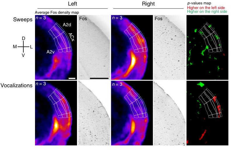 But this left brain bias for processing communicative sounds extends beyond maternal behaviors in mice. In fact, male mice also show left-biased auditory processing of vocalizations. A recent study found that more neurons in the left than right auditory cortex in male mice were activated by recordings of mouse vocalizations, whereas more neurons in the right auditory cortex were activated by frequency sweeps (rapid increases or decreases in pitch) [10]. This is starkly reminiscent of findings in humans; although language processing is left-lateralized, things like pitch and intonation seem to be biased towards the right (hence why the right hemisphere has been reported to be especially responsive to music [11] ). The researchers also found that neurons in the left hemisphere were activated preferentially by downward sweeps from high to low frequencies – a particularly common feature in mouse vocalizations – whereas neurons in the right hemisphere were more variable in their sweep direction preferences. However, normal auditory experience was required for vocalization processing to become left-lateralized [10]. This is similar to Ehret’s findings that leftward bias was absent in inexperienced female mice and the fact that leftward bias of oxytocin receptors in the left auditory cortex is absent early in development [9].