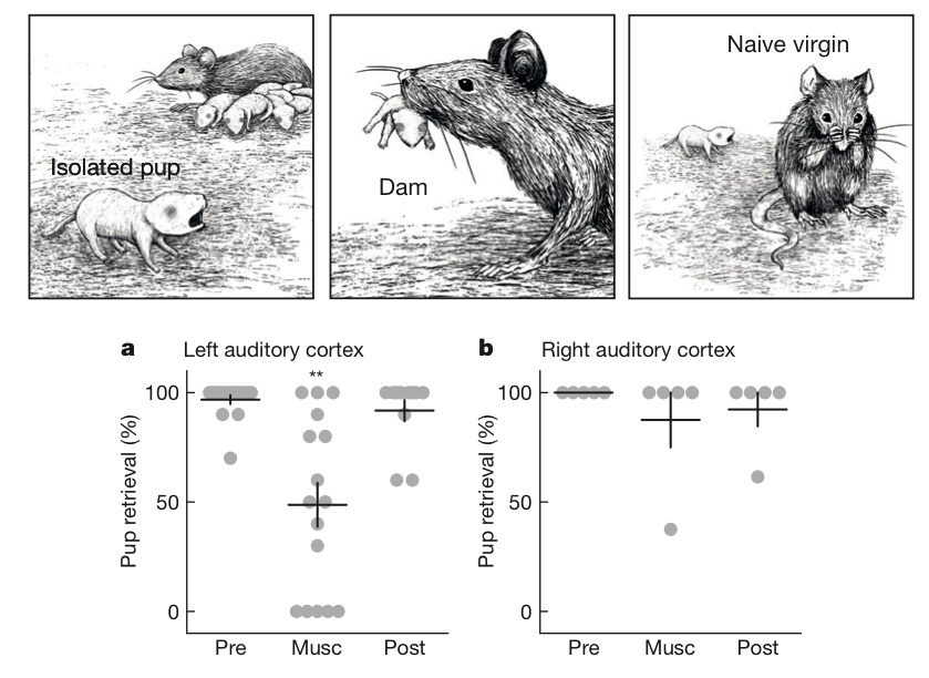 How is it that the exact same auditory stimulus can be processed preferentially by the left brain in mouse moms but not in inexperienced females? More recent studies have offered evidence that oxytocin – a brain hormone closely associated with social behaviors such as pair bonding and maternal care – plays a key role and displays its own left brain bias. Recall from Ehret’s research that the inexperienced females, in contrast to the experienced moms, had to be specifically trained to respond to the pup cries. But Marlin et al., (2015) found that if the inexperienced females were given a boost of oxytocin and a few days to observe experienced moms in action, they started bringing distressed pups back to the nest at a higher rate (you might say that they became “better moms”). Moreover, the left, but not the right, auditory cortex was necessary for the moms to retrieve crying pups [8].