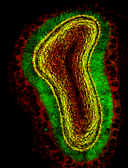 Microscopic image of a mouse brain during neurotransmitter switching. This image shows neurons that produce two different neurotransmitters labeled with either red or green fluorescence. Once switching occurs a yellow signal is produced. Image featured as cover art of the Journal of Neuroscience in May 2020 [2].