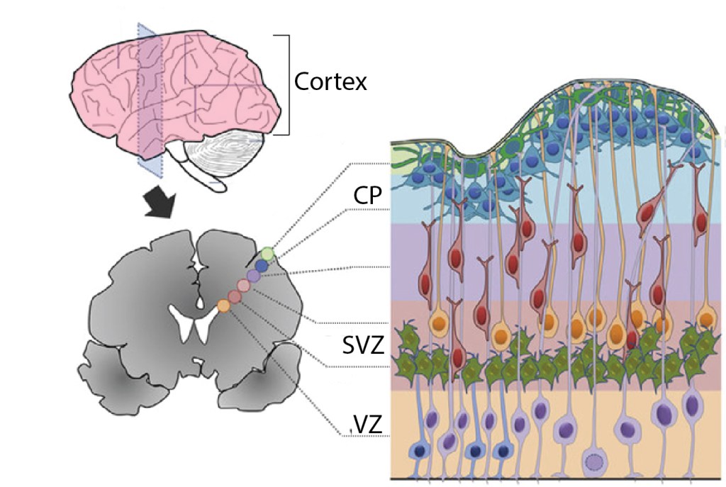 Neuronal progenitors are stem cells that produce neurons to populate the brain during early development; this process is called neurogenesis. The progenitors that produce all the excitatory neurons in the cortex—the wrinkly outer portion of the brain—are found in regions buried deep in the center of the brain, the VZ and SVZ, as shown in Figure 1. Neurogenesis must be tightly controlled so that the correct numbers and types of cells are produced at the right times. Since this is one of the first stages of brain development, abnormalities here—for example, too many or too few neurons produced—can disrupt everything that happens next, such as arranging cells in layers, forming synapses, and setting up brain circuits. So how is neurogenesis controlled? Microglia act as one way to put the brakes on neuronal progenitors.