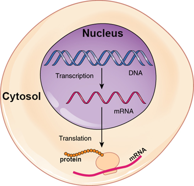 You may be aware that proteins are responsible for performing countless duties in the body. There are proteins, like collagen, that help make up the structure of your body, proteins like insulin that act as hormones, and the list goes on and on; proteins are very important for your body to function. But where do proteins come from? And the answer is not from eating meat and beans. When you eat foods high in protein your body breaks them down into the parts that make them up (called amino acids). Then your body makes its own proteins, which are made of a specific sequence of parts (amino acids) that give the protein the correct shape to do its necessary function, like provide structural support for the body. So how does the body know how to string together the correct parts to make the correct protein? That is where genes come into play, which are just specific chunks of DNA. The DNA, which is kept inside the nucleus of the cell, is essentially like a recipe book. It stores all of the information necessary to make the individual. But just like in a recipe book, in order to get the final product, such as chocolate cookies, you must follow that recipe and put in the right ingredients in the right order. But the DNA is very important, it’s the cells only copy of all the genetic information, which is why it’s safely kept inside the nucleus. So instead of just using the recipe to make the cookies if you will, instead what happens is the recipe is copied (in a process called transcription) and that copy leaves nucleus (into what is called the cytosol) where it can be used to make the final product, aka a protein. The “copy” of the gene which leaves the nucleus to be “read off” to make the protein is called mRNA. The process of using the mRNA recipe to make the actual protein is called translation. So the more a gene is transcribed into RNA and made into a protein, the more of that protein there will be in the cell. If something were to turn off transcription of a gene that would result in less protein being made.