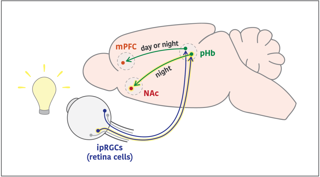 A few years earlier, scientists in Dr. Samer Hattar’s lab at Johns Hopkins University showed that one of the main brain areas these retina cells communicate with is a section of the thalamus called the perihabenular nucleus (pHb) [5]. The pHb receives light signals from the retina and then sends this information to either the medial prefrontal cortex (mPFC) or the nucleus accumbens (NAc), two brain regions involved in regulating mood and depression.