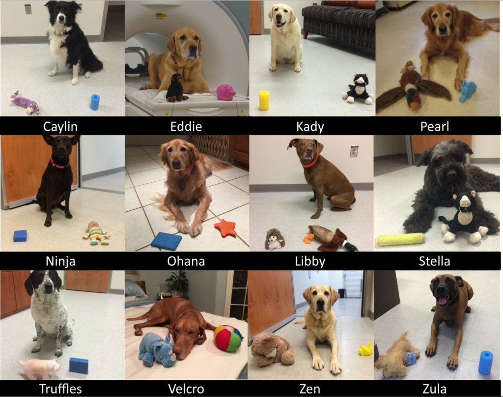 Luckily for us, neuroscientists have begun to use modern brain imaging techniques to answer just this question about man’s best friend. In 2018, neuroscientists from Emory University [2] asked whether dogs could differentiate between words they know and fake words with a similar structure using a common neuroimaging technique called functional magnetic resonance imaging (fMRI), which measures blood flow to different parts of the brain as a signal that those areas are more active during a certain task. First, the dogs were trained at home to discriminate between two toys (e.g. Libby learned to associate “hedgehog” and “duck” with her toys in the picture below). Right before their brain scan, the dogs were tested by their owners in the laboratory to make sure they could retrieve the right toy when the owner said its name. Then, the dogs were placed in the fMRI machine, and their brains were scanned while their owner said either their expected words (“hedgehog” or “duck”) or pseudowords that are similar to these short English words, but aren’t words at all (like “cloft” and “bobbu”). I must point out that fMRI scans require patients to stay completely still for long periods of time, proving this group of dogs to be the goodest boys and girls to remain stationary in the machine without the use of restraints or anesthesia. Check out this Tedx talk from Dr. Gregory Berns, the leader of this research group, to see how the dogs were trained to have their brains scanned.