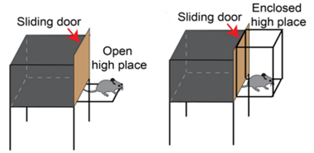 In this study, Dr. Jun Liu and colleagues worked to identify subgroups of BLA neurons which were activated specifically when the mice were in high places. The group of BLA neurons focused on in this study proved to be distinct from neighboring BLA neurons that showed activation following exposure to other fearful stimuli, such as odors from predators, startling auditory tones, and looming shadows designed to simulate approaching predators. The fact that the neurons they focused on didn’t become active during those other fearful situations importantly helped to prove that there are specific neurons in the BLA that function to encode a fear of heights. When recording from these ‘high place fear’ associated neurons, their results showed that mice who were placed in high-up environments displayed a significant increase in BLA neuron activity2. In addition to increased neural activity, mice also displayed increased freezing behavior and increased heart rates, two common indicators of fear and stress. Interestingly, the BLA was strongly activated when the mice were placed on an open platform, but not when they were placed in a transparent, enclosed platform, indicating that the increase in fear perception was limited to platforms upon which they were less secure (Fig. 2). Much like humans who may feel more comfortable looking out a window from the top of the Empire State Building, but not walking to the edge, the fear of heights seems to be associated with the perception of the likelihood of falling.
