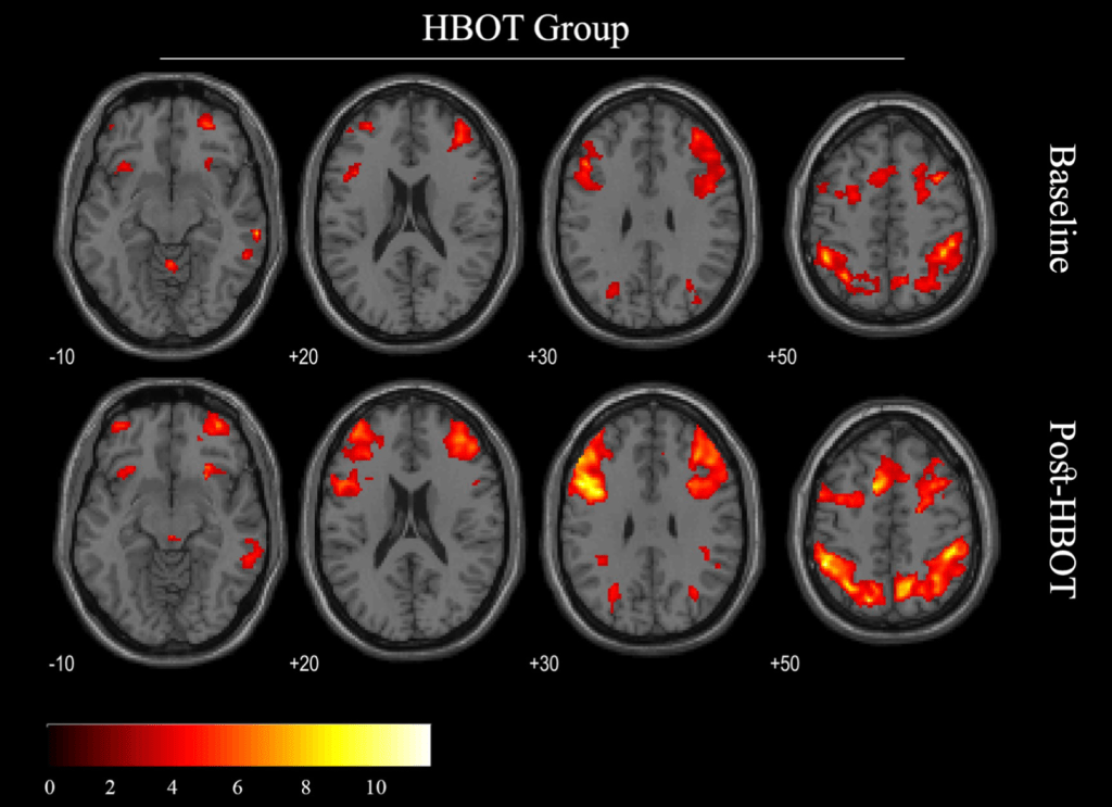 Given our current understanding of PTSD symptoms and effects on the brain, a 2022 study from researchers in Israel [7] endeavored to determine whether HBOT could benefit veterans with PTSD that weren’t responsive to the usual treatment options by investigating both their symptoms and the structure and activity in their brains before and after HBOT treatment. Importantly, this publication followed up on a series of papers which indicated that HBOT can relieve symptoms of PTSD in veterans suffering from TBI. While those studies found that HBOT improved the patients’ PTSD symptoms, it was unclear whether the treatment had an effect on PTSD directly or whether the improved PTSD symptoms were a secondary effect of treating the TBI. Therefore, these authors selected patients that experienced PTSD in the absence of traumatic brain injury. Half of the patients were assigned to the treatment group that received HBOT and the other half were assigned to the control group and didn’t receive any additional treatment – both groups continued the therapy and medications they were already taking before the study throughout.