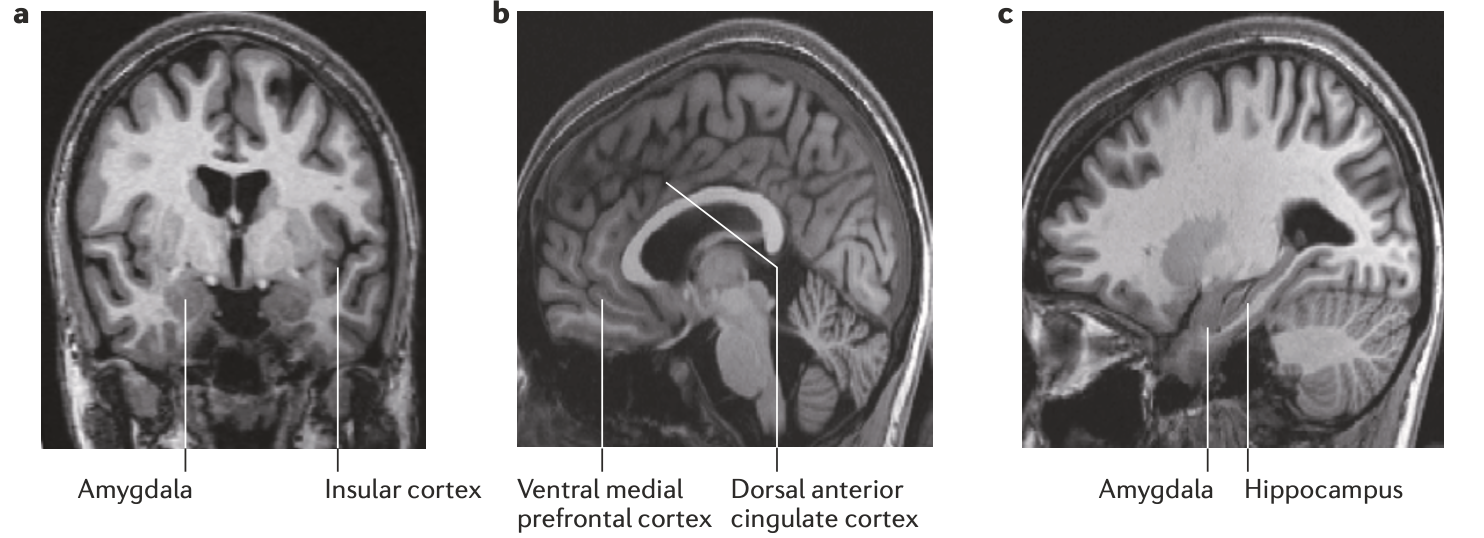 More recently, neuroimaging in humans [6] has uncovered some notable changes in the structure and function of the brains of patients experiencing PTSD. Structurally, PTSD is correlated with smaller volume of the hippocampus (the memory center of our brain) and the prefrontal cortex (a region right at the very front of our brain that is involved in “executive functions,” like planning and decision making). There are noted issues in the quality of the nerve bundles that send information from another area of the cortex (the anterior cingulate cortex, or ACC, which is involved in pain perception and the learning of fearful stimuli) to the amygdala (our brain’s major fear center that recognizes fearful situations and coordinates our response to fear).