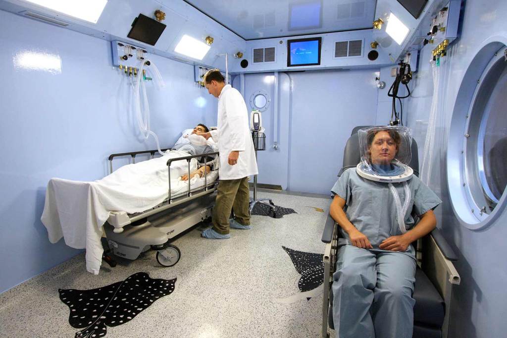 Outside of diving, HBOT is surprisingly also used to treat a host of medical maladies, such as infections, burns, wounds that won’t heal, and carbon monoxide poisoning. This is because supplying oxygen at two to three times the normal pressure allows moreoxygen to enter the bloodstream, and then tissues all over the body, as compared to breathing 100% oxygen in a normal room. Having extra oxygen in the bloodstream to supply to our cells supports their critical functions. According to the Mayo Clinic, the increased oxygen also helps fight bacteria and stimulates the release of certain proteins in our cells that promote healing.