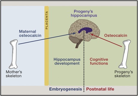 In follow-up studies, several behavioral assays showed that these OCN-lacking mice were also more anxious and worse at spatial memory tasks than their normal counterparts [2]. They proceeded to carry out more experiments to figure out why this might be. OCN is secreted from bones and makes its way to the bloodstream, acting like a hormone, and binds to neurons in several key brain regions such as the hippocampus, which is important for learning and memory. OCN-lacking mice had a marked decrease in their brain’s ability to produce monoamine neurotransmitters, which neurons use to communicate with each other, and had increased levels of the inhibitory neurotransmitter GABA [2]. In perhaps, their most surprising finding, the researchers discovered that during a mouse’s pregnancy, the mother’s bones will secrete OCN which is taken up by her pups [2]. This OCN was found to be essential for the proper development of the pup’s hippocampus and that without it, the pup is born with a shrunken hippocampus.