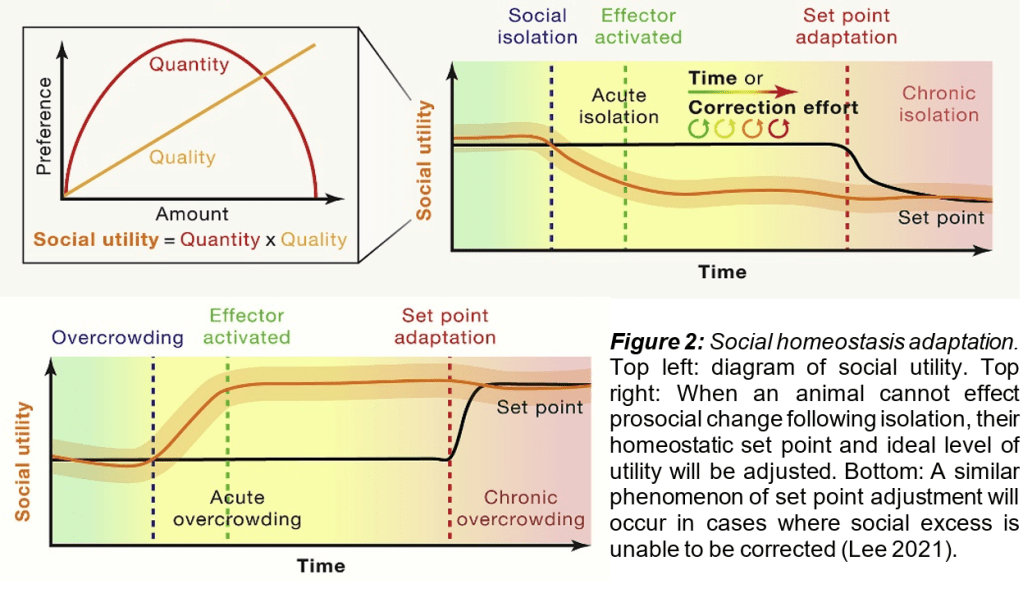 A recent review, written by a UCSD Neuroscience graduate student, recently explored the concept of social homeostasis. General homeostasis is defined as the physiological means of maintaining stability in the body, including compensatory mechanisms the body can use to bring itself back to baseline after aberrations from a ‘set point’6. In a homeostatic system, a receptor will detect the deviation from baseline. Next, a control center – a neural system specializing in calculating changes from the norm – will process the divergence. Finally, an effector system will enact a process aimed to reestablish homeostasis (an example of physiological homeostasis is shivering to regulate body temperature – check out this recent NeuWrite article if this intrigues you). Social homeostasis, aptly, is “the ability of an individual to detect the quantity and quality of social contact, compare it to an established set-point in a command center, and adjust the effort expended to seek social contact through an effector system”7. This review proposed a model for changes in animals’ homeostatic set point resulting from chronic alterations in social interaction. To understand why a change in this set point may occur, they introduce the concept of social utility, which is essentially the relationship between the quality and quantity of social interactions. Figure 2 demonstrates scenarios in which an animal is either socially isolated or in an overcrowded environment. Each of these scenarios leads to a change in social utility. As the effector system is enacted, the animal will be driven respectively to increase or decrease prosocial behaviors in an attempt to maintain social homeostasis. In isolation, this will fail – leading to a compensatory adjustment of the homeostatic set point.