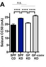 But how do we know that we also need a healthy gut microbiome, and the keto diet isn’t sufficient for seizure protection by itself? That’s where understanding the figure to the left can help us. In this figure, the graph tracks differences in seizure threshold between those on the keto diet vs control diet and those with a healthy microbiome vs those without one. We see dramatically increased seizure thresholds in both groups with a healthy gut microbiome and fed the keto diet (bar 2 and 4, acronyms are listed in the table on the left). If all that was needed was the KD, all of the mice on the KD would have relatively equal, elevated seizure thresholds. However, only the mice with an intact gut microbiome and being fed the KD at the same time (SPF KD and GF-conv KD) were able to reap the benefits. Hence, necessary but not sufficient.