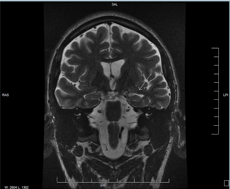 I suffered a severe traumatic brain injury and was diagnosed with posttraumatic epilepsy early on in my recovery. Recently, however, I decided to see an epileptologist, or a neurologist who specializes in treating patients with epilepsy. Finding it weird that it never came to my mind to see an epileptologist, I decided to do so back in August of 2022 because I was having more frequent seizures. The doctor decided to order MRI scans of my brain; the MRI images showed left-sided MTS, and furthermore MTLE. One of the MRI images that shows the evidence of MTS is shown below.