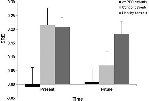 Those with damage to their vmPFC exhibited little to no evidence of SRE, meaning that they were unable to identify traits that described themselves or were uncertain about them. Furthermore, this lack was identified both when individuals were asked about their present self and future self. In healthy and control patients, however, SRE was correlated with activity in the vmPFC, with both information about the self from the present and future. The vmPFC did show diminished activity with regard to information regarding the future self, but this difference was proportional across all three groups.