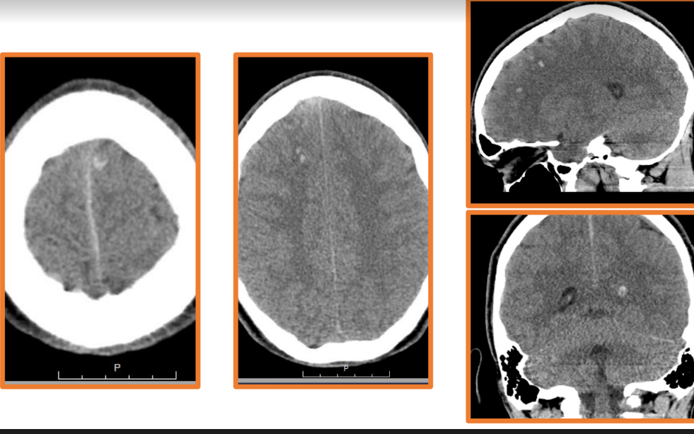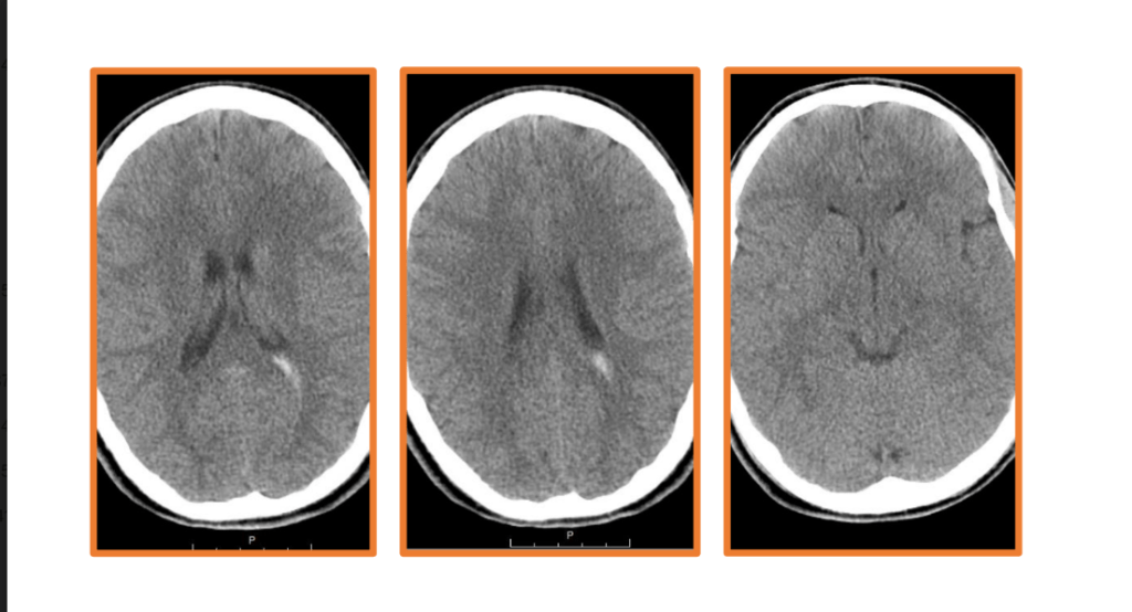 Here I have some CT and MRI images taken soon after my injury. The blurred parts of the MRI image towards the center show evidence of shearing. In addition, the bright white portions of the CT images represent accumulations of blood, known as hemorrhages. These also contributed to the extent of my injury. Had the emergency staff not implanted what is known as an intracranial pressure cup (ICP) to relieve the pressure from the excess fluid within my cranial cavity, my brain would have been displaced and squished down by the fluid, and the extent of my injury would have been much worse, potentially even fatal.