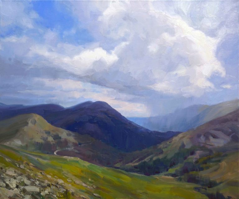 Additionally, cues from perspective may be used to appreciate depth. Linear perspective is a tool often used in art; when parallel lines converge in the distance, like a road growing smaller as it extends away from the viewer, a great sense of depth is created. This is because, in reality, when linear cues converge, we perceive them to be further away. Alternatively, aerial perspective relies on our color vision and blue light in the atmosphere. Scattered light in the distance causes a hazier, blue tinted visual experience when compared to nearer, more detailed objects in a clearer atmosphere. This perspective tool is also used frequently in art, when mountain ranges are often painted in a blue gradient to indicate distance (Figure 4; [1]; [6]). In addition to being cast in blue, objects in the distance also tend to lack detail that is perceivable in closer objects. This texture gradient is a useful tool to discern how far away an object is, as humans are deeply familiar with the amount of detail their vision is capable of detecting at key distances [7]. Lastly, light and shadows may be used to gauge depth; in typical circumstances, light originates from above, and directionally cast shadows provide information about the object’s location in space.