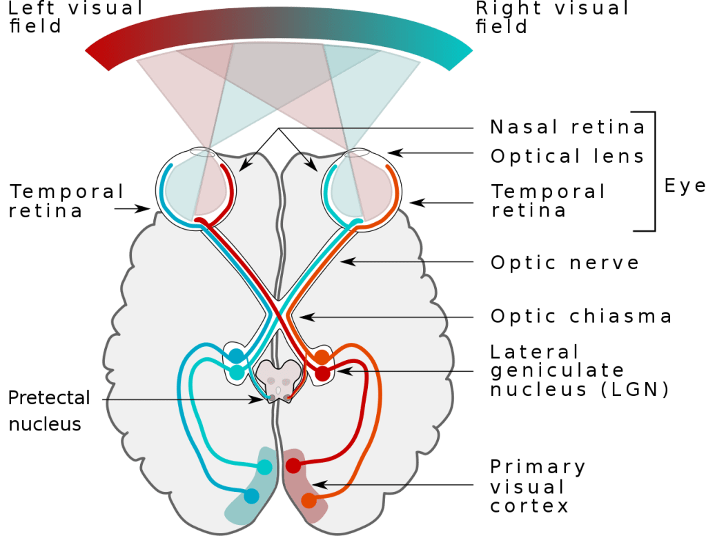 As a visual signal travels down the optic nerve, it decussates (i.e., crosses from one side to the other) at an area called the Optic Chiasm (Figure 3). Indeed, visual information is primarily processed in the hemisphere of the brain contralateral (opposite) to the eye of origin! Next, visual signal passes through the Lateral Geniculate Nucleus (LGN). The LGN is involved in color processing as well as determining relative position of objects in an eye’s field of view [4]. The destination of this pathway is the primary visual cortex, where a map of visual information is created [5]. The cortex also communicates with neighboring cortical areas and the LGN to modulate visual processing.
