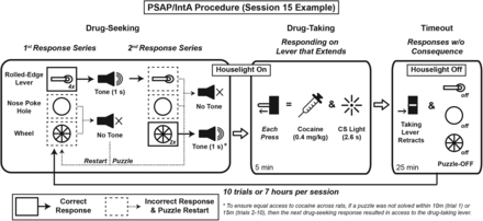 The study tested mice with PSAP for twenty days, with 10 trials per day. It was designed that puzzles increased in difficulty throughout the day, and each subsequent day. Each puzzle consisted of any number of lever presses, a nose pokes, and/or a wheel turns, and every puzzle switched up which task and how many times. For instance, on day 1, the rats simply had to perform one nose poke for the drug-taking lever to extend. On the otherhand, on day 20, they had to do 4 lever presses and 1 nose poke to self-administer the drug. Furthermore, each time a puzzle was failed, the rat had to restart it from the beginning. The idea behind having such elaborate procedures was to make it so the rats never formed a habit of drug-seeking and taking behaviors. Furthermore, by making the rats restart the puzzle every time they failed, it allowed the researchers to see if the rats would still persist in drug-seeking behaviors despite obstacles.