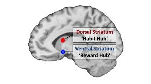 The other division of the striatum, the dorsal striatum, uses dopamine in a little bit of a different way than the ventral striatum. It motivates us to initiate movements by rewarding us with dopamine, and has two substructures: the dorsomedial striatum (DMS) and the dorsolateral striatum (DLS) (4). Although these two divisions both play a role in helping us execute actions, they take a slightly different approach to doing so, via goal-directed actions (DMS) or habits (DLS). Goal-directed actions are the actions we do every day where we consciously make an effort: you raise your hand in class to answer a question, you write an email to your boss explaining why you were late on the deadline for that project. Habits, on the other hand, are those actions that do not take much conscious effort for us to perform; they become second nature, like your daily morning routine when you’re getting ready for work. These two types of actions lay opposite each other, and thus are mediated separately. In fact, research has found that when you lesion the brain area responsible for one of these types of behavior, the other behavior is still present and takes more precedence (4). Researchers have also shown that, throughout training and habit acquisition, the transfer in excitation from DMS to DLS coincides with the change from goal-directed action to habit (4).