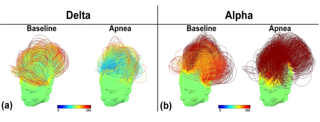 Fig 6. EEG-based connectivity in the delta (a) and alpha (b) frequency bands, during baseline and apnea conditions.