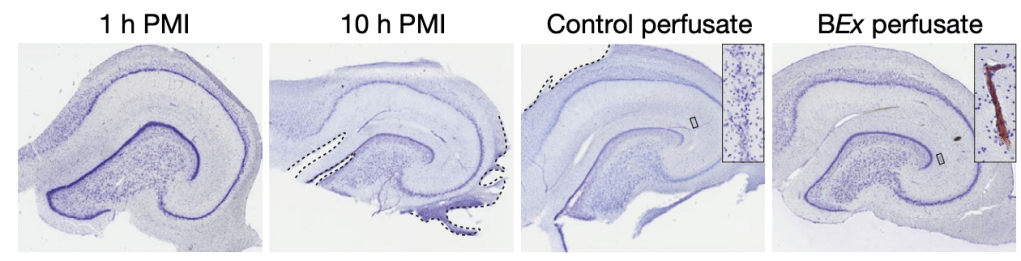 Para ello, examinaron primero las células neuronales en áreas altamente susceptibles a la pérdida de oxígeno y sangre tras la muerte o tras un infarto cerebral. Tras remover los cerebros de la maquinaria BrainEx, tomaron rodajas de dichas áreas y tiñeron los cuerpos celulares para visualizar la estructura global. Encontraron que los cerebros que se habían perfundido con la solución BrainEx eran comparables a los que se habían sacado del cráneo tan solo 1 hora después de morir, mientras que las células de los cerebros en otros grupos mostraron un deterioro obvio. Estos resultados sugerían que fueron capaces de prevenir gran parte del daño que los cerebros que recibieron la solución control demostraron o aquellos cerebros que fueron sacados del cráneo a las 10 horas de morir. Esto queda reflejado en la figura siguiente, que muestra la tinción del hipocampo.